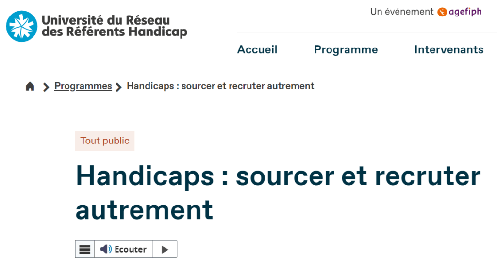 Lors de l’Université du Réseau des Référents Handicap, organisée par l’AGEFIPH au Havre, une table ronde dédié au « sourcing » et « recrutement » des personnes en situation de handicap a retenu notre attention.